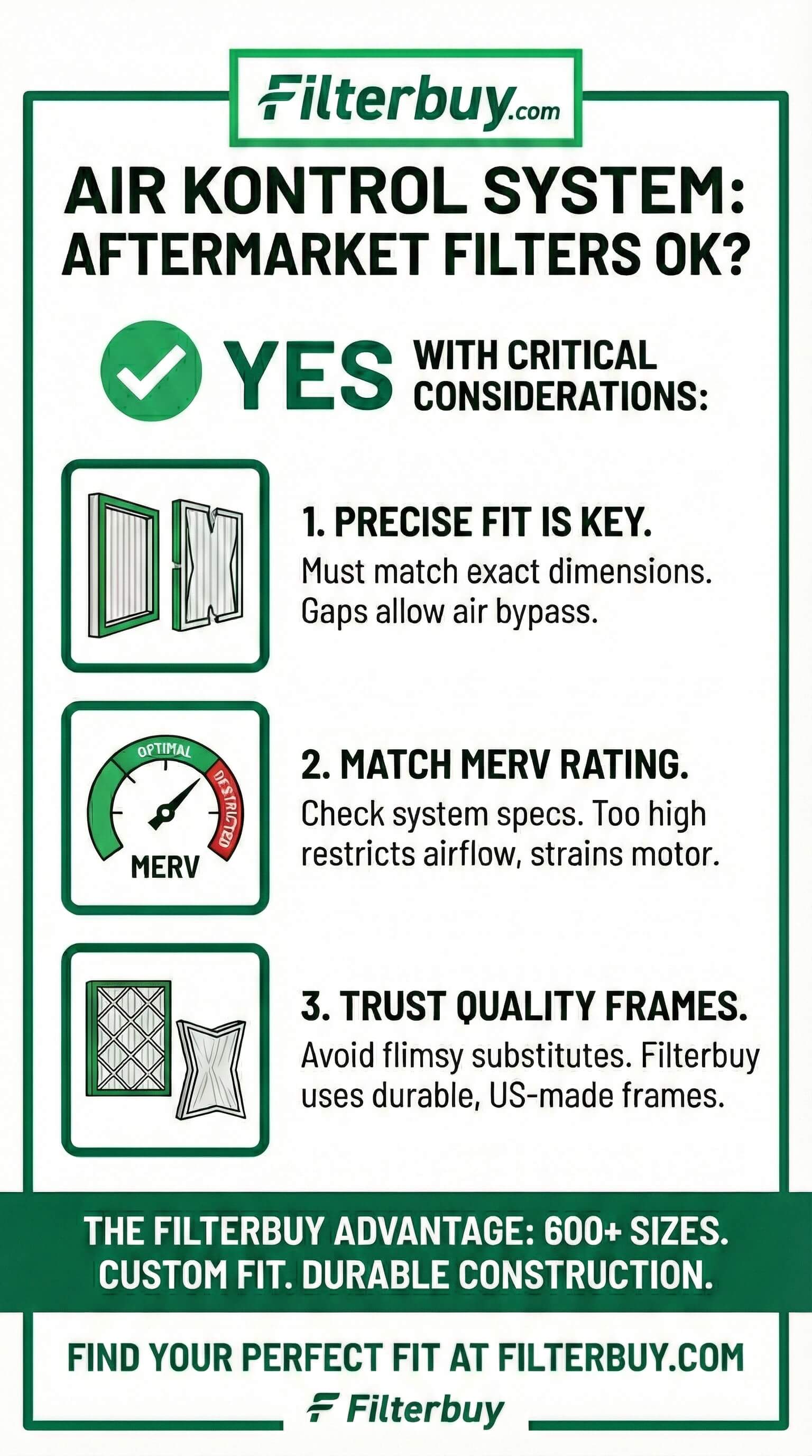 • Compatibility: Match exact dimensions—aftermarket filters fit Air Kontrol systems perfectly.
